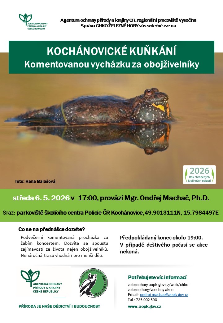 Podvečerní komentovaná procházka za žabím koncertem. Dozvíte se spoustu zajímavostí ze života nejen obojživelníků. Nenáročná trasa vhodná i pro menší děti.