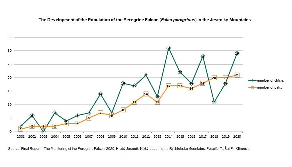 Contemporary nesting of the peregrine falcon in the Jeseníky Mountains dates back to 2001. Since that year, the population has constantly been growing. Just as the man played an important role in the falcon's return to the nature, so man continues to be involved in the strengthening of the Jeseníky Mountain’s population of this species – by monitoring, adjusting and, above all, by protection of the nesting sites. The historically mentioned twenty nesting sites have gradually become occupied by falcons within twenty years of the first documented nesting. Thus, the return was quite fast and successful. From the very beginning, the Jeseníky population has been closely monitored, and the results have been evaluated on annual basis.